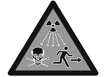 新標志為黑框紅底三角,內(nèi)有一個輻射波標記、一個骷髏頭標記和一個逃跑的人形。