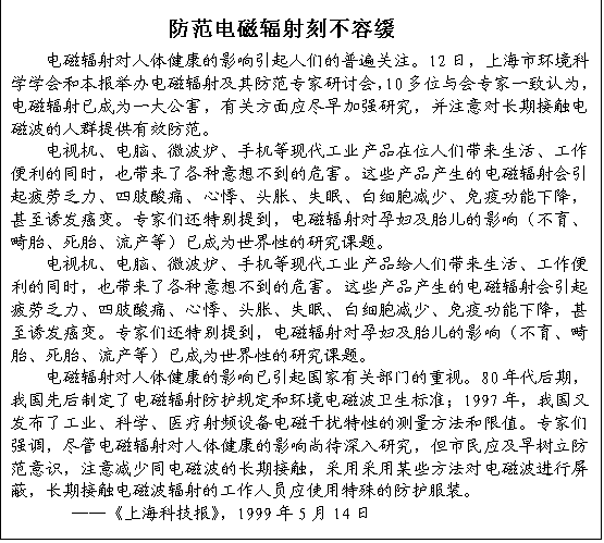 我們希望政府及有關(guān)職能部門采取切實措施,組織一些有關(guān)電磁知識的宣傳活動,讓人們在利用電磁波的同時清醒的意識到電磁波的危害,增強自我防護(hù)意識。如果需要,我們中學(xué)生愿意成為電磁輻射的義務(wù)宣傳員。具體措施如下: